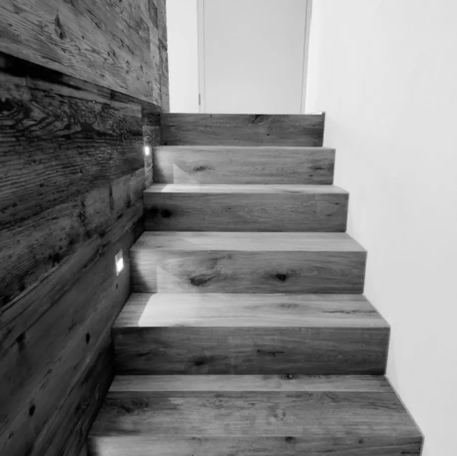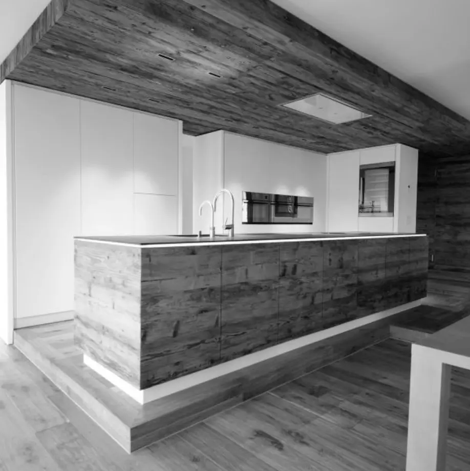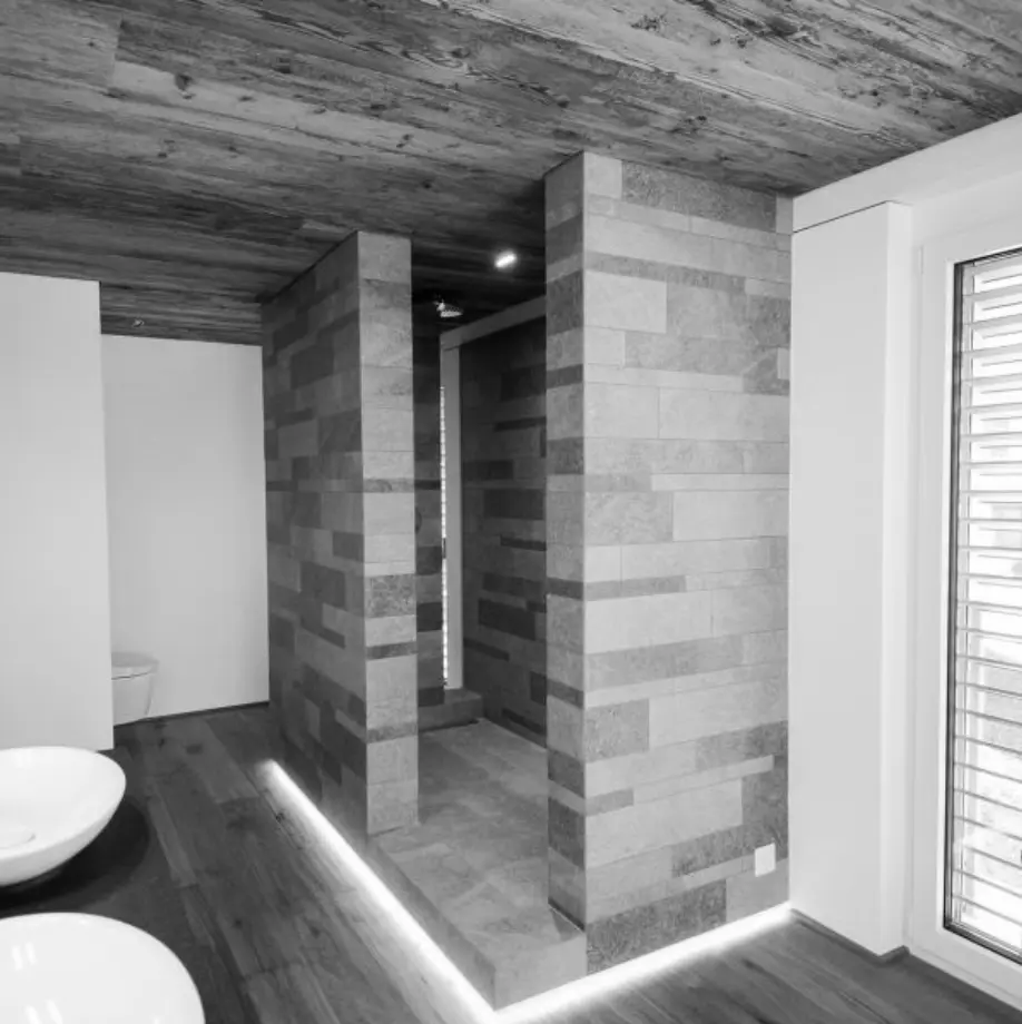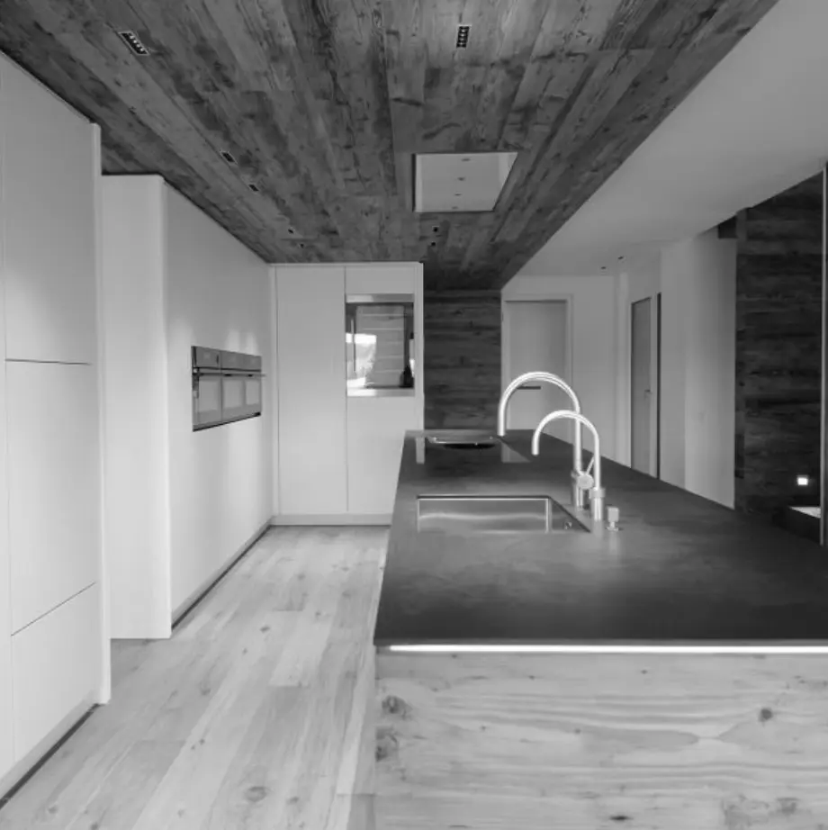 Das Landhaus wurde mit stilvollen Raumelementen aus gekonnten Kombinationen von ausgewählten Materialien wie Altholz realisiert. Die Raumstimmung wird durch kurze, lineare Leuchten akzentuiert. Dabei werden die Materialien, Oberflächen und Proportionen durch punktuelles Licht hervorgehoben und in ihrer Eleganz betont, während die indirekte Beleuchtung eine ausgewogene Lichtstimmung und ein angenehmes Raumgefühl schafft.